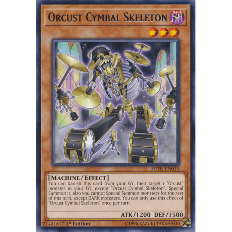 Vous pouvez bannir cette carte depuis votre Cimetire, puis ciblez 1 monstre “Orcust” (“Squelette de Cymbale Orcust” exclu) dans votre Cimetire ; Invoquez-le Spcialement, et aussi, vous ne pouvez pas Invoquer Spcialement de monstres (monstres TNBRES exclus) le reste de ce tour. Vous ne pouvez utiliser cet effet de “Squelette de Cymbale Orcust” qu’une fois par tour.