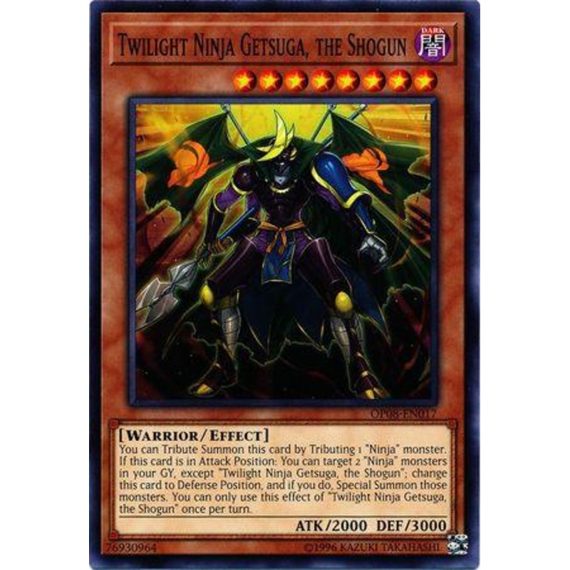 Vous pouvez Invoquer par Sacrifice cette carte en Sacrifiant 1 monstre “Ninja”. Si cette carte est en Position d’Attaque : vous pouvez cibler 2 monstres “Ninja” (“Twilight Ninja Getsuga, le Shogun” exclu) dans votre Cimetire ; changez cette carte en Position de Dfense, et si vous le faites, Invoquez Spcialement ces monstres. Vous ne pouvez utiliser cet effet de “Twilight Ninja Getsuga, le Shogun” qu’une fois par tour.